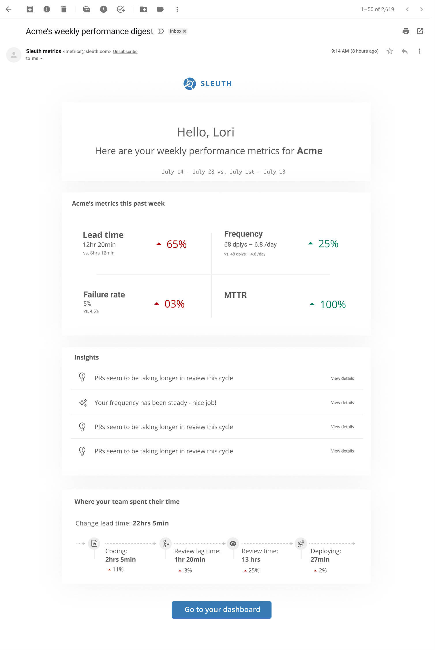 Subscribe to your metrics digest so when Monday morning rolls around, you’ll know if you’ve got any insights to investigate. Quickly jump from your email to dig into an insight and find out what’s really going on. From there, Sleuth arms you with the information you need to either dig in with your team or to implement one of the many Sleuth tools to improve.